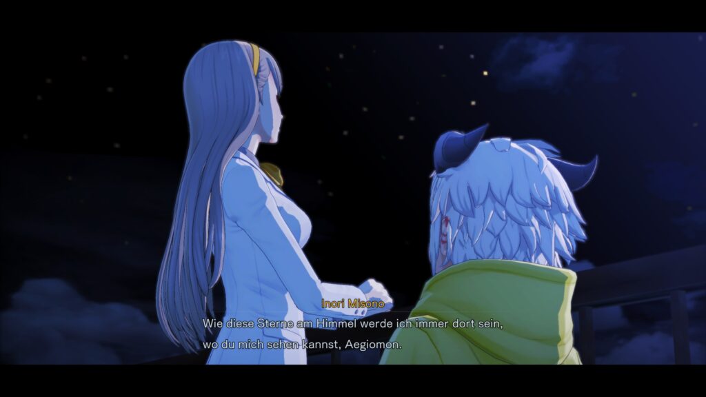 Das Digimon hat sich direkt auf das Dach des Wohnhauses zurückgezogen. Nach einem kurzen Gespräch macht sich auch Inori dorthin auf. Sie spricht mit Aegiomon und verspricht ihm, immer an seiner Seite zu sein. So wie die Sterne über ihnen Leuchten. Sie gesteht ihm, dass sie ihre Mutter und ihren kleinen Bruder Yuu verloren hat und das Digimon, als es mit dem Hoodie vor ihr stand, an dieses erinnert hat. Daher möchte sie immer an seiner Seite sein.