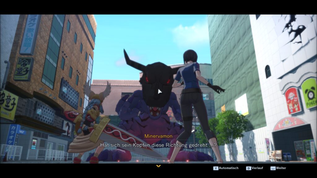 Wir machen uns – nach einigen Kartenspielen – auf zum Ort des Geschehens. Eine riesige Menschenmenge hat sich bereits um einen Riss versammelt. Wir eilen hin, da fällt uns Minervamon entgegen. Ein blaues Greymon ist ihr dicht auf den Fersen. Wir verbünden uns und besiegen diesen Riesen.
