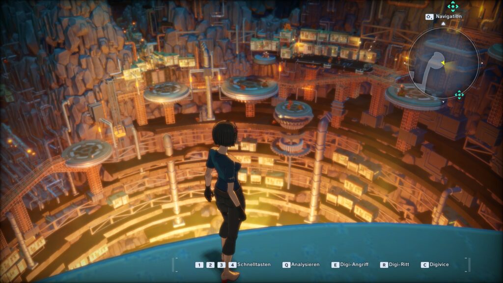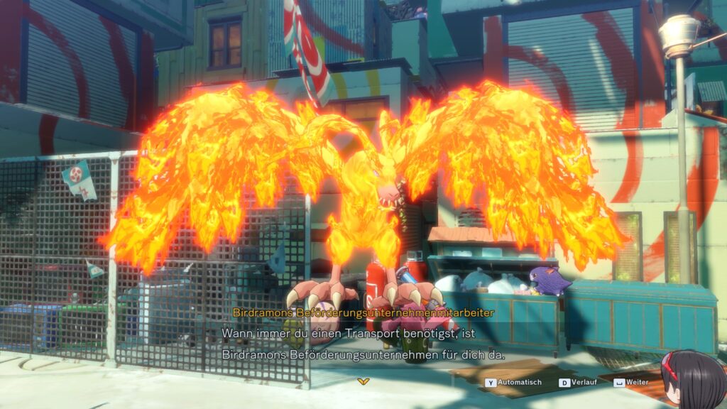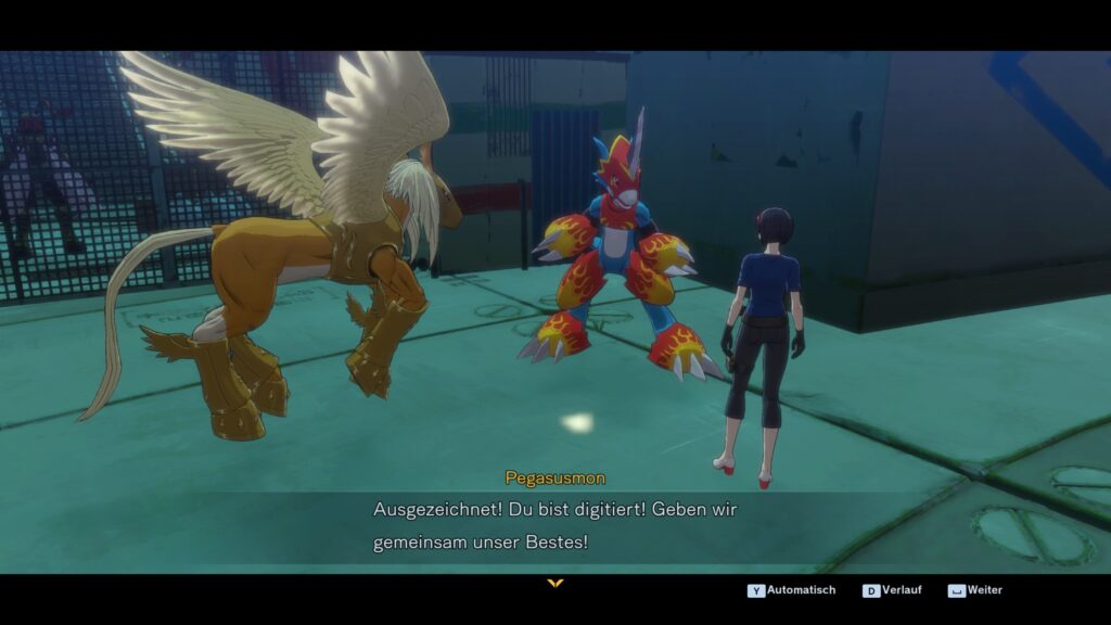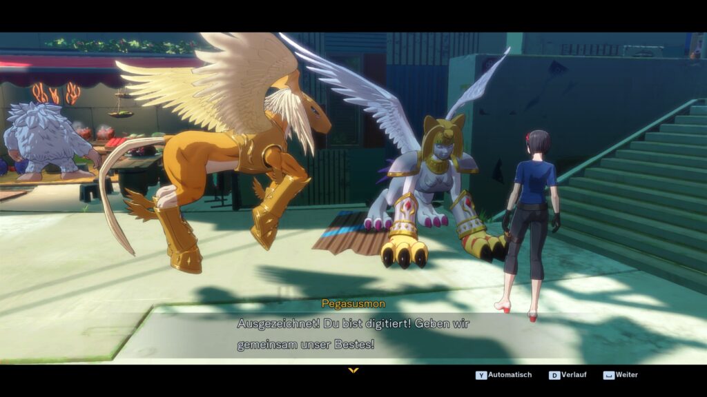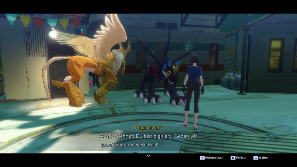 Bevor wir in den Zug steigen, kümmern wir uns wieder um eine Nebenquest. Dieses Mal bittet uns Pegasusmon um Hilfe. Es möchte anderen Digimon zur Digitation verhelfen, besonders denen, die zur Rüstungsklasse digitieren können – so wie er. Doch dafür braucht er Armoreier und möchte als erstes das Armorei der Aufrichtigkeit. Da wir keins dabei haben, sagt es uns, dass Vulcanusmon uns dabei wohl helfen könnte. Aus diesem Grund gehts zurück ins Industriegebiet. Dort stellen wir das Armorei her und bringen es Pegasusmon. Gemeinsam machen wir uns zu einem Hawkmon auf, welches damit digitiert. Danach bittet uns Pegasusmon noch um die Digi-Armoreier des Mutes, der Freundschaft und des Lichts. Diese beschaffen wir auf die gleiche Weise, wodurch uns jetzt auch diese Digitationen zur Verfügung stehen.