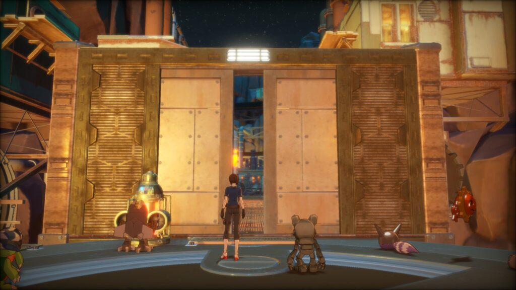 Auf dem Weg hin werden wir von unbekannten Digimon angegriffen. Blimpmon muss eine Notlandung machen und bittet uns, im nahegelegenen Dorf nach dem Rechten zu sehen. Wir treffen auf ein goldenes Guardromon, das uns zunächst für Eindringlinge hält, uns dann aber die Lage beschreibt. Die Titanen haben einen Teil des zentralen Kontrollsystems übernommen, dazu kommen verrücktspielende Kameraden von ihm. Und sie haben den Kontakt zu Vulcanusmon verloren. Er ist für die Stromversorgung zuständig und der Boss des Gebiets. Um die unterste Ebene zu erreichen, so Guardromon, brauchen wir die Hilfe von Kokuwamon, das ist für die Schotten zuständig. Leider hat es sich etwas überanstrengt, wartet jedoch am ersten Schott auf ein Ersatzteil, um sich reparieren zu können. Derweil werden die Guardromon Blimpmon reparieren.