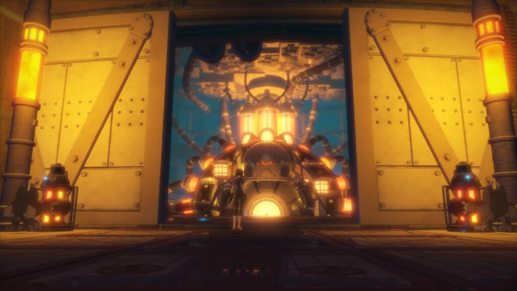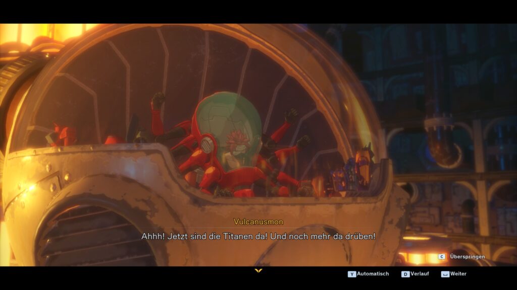 Unten angekommen öffnen uns die Kokuwamon das Tor. Dahinter finden wir Vulcanusmon, der in seine Arbeit vertieft ist. Als wir ihn unterbrechen hält er uns direkt für Titanen und greift uns an. Hierzu ruft er zwei mechanische Hände, sobald die besiegt sind, erscheinen vier davon – immer mit einem unterschiedlichen Typus – erst dann können wir ihn angreifen. Da er uns nicht zuhören will, müssen wir dafür Sorgen, dass er es tut. Nachdem wir ihm alles erklären konnten, stellt er den Strom wieder her, sodass die Bahn jetzt nutzbar sein sollte.