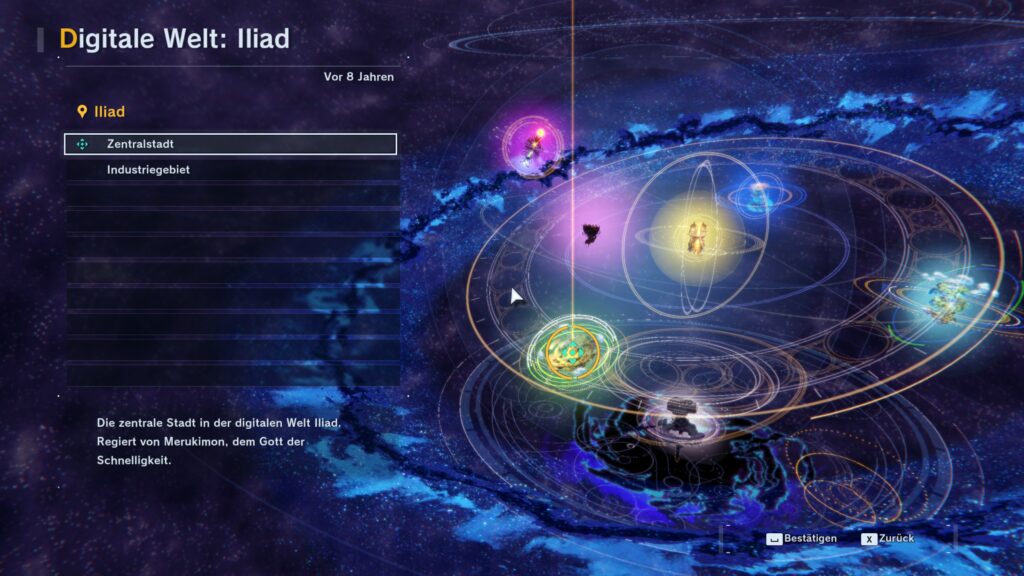 Zunächst danken uns Merukimon und Minervamon für unsere Hilfe. Danach haben sie schlechte Nachrichten für uns. Leider können sie uns nicht so ohne weiteres in unsere Welt zurückschicken. Die Titanen sind an verschiedenen Orten eingefallen und müssen beseitigt werden. Sobald das geschehen ist, können wir in Junomons Tempel und mit ihr alles weitere klären. Dorthin kommt man jedoch am besten mit der Locomon Bahn, die aktuell ausgefallen ist, weil die Stromversorgung im Industriegebiet ausgefallen ist. Merukimon bittet uns, dass wir uns das ansehen. Also machen wir uns zum Zentralplatz auf, dort wartet Blimpmon auf uns, dass uns dorthin bringt.