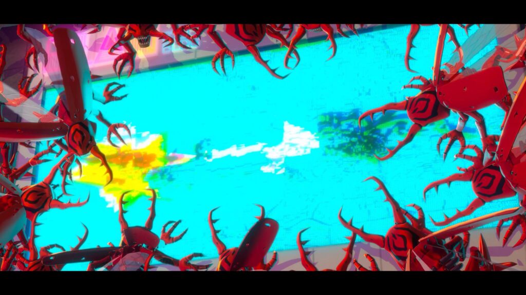 Diese wird bereits von Digimon überflutet. Auch wir fallen aus dem Tor am Himmel, werden aber zum Glück von einem Pegasusmon aufgefangen.