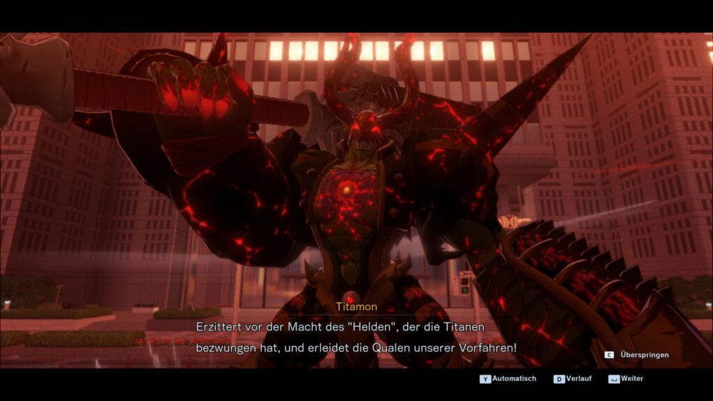 Der Weg zum Metropolitan Government Building ist frei und wir machen uns auf den Weg. Bevor wir jedoch den Orb in die Finger bekommen, kommt uns Titamon zuvor. Ein Kampf mit ihm und seinem Reittier SkullBaluchimon beginnt. Es wirkt fast so, als würde sich durch unser Zutun die Vergangenheit so verändern, dass das Shinjuku-Inferno viel früher stattfindet, als uns bekannt ist. Wir werden nachdenklich und offenbaren Inori und Aegiochusmon, dass wir aus der Zukunft kommen.