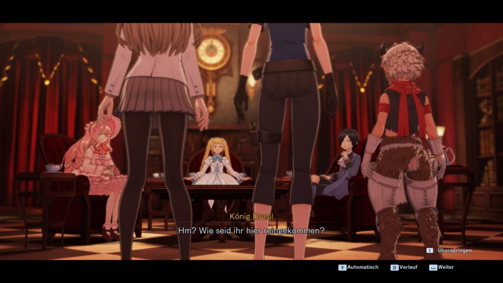 Das Theater ist komplett leer und kaum beleuchtet. Es wirkt anders als in seinem normalen Zustand, wenn wir es betreten. Wir gehen durch die Halle und sehen uns um. Vor der Treppe rechts den Gang hinunter ist eine Tür offen. Dort treffen wir drei Kinder(?). Sie heißen König Drasil, Kunlun und Homeros – stellen sich uns aber nicht vor. Sie sind genauso verwundert wie wir, dass wir plötzlich vor ihnen stehen. Sie wollen wissen, wie wir hergekommen sind. Warten aber keine Antwort ab. Uns wollen sie ebenfalls nicht sagen. Statt Antworten zu erhalten, schicken sie uns also weg. Irgendwas ist nicht richtig verlaufen. Die Boden unter unseren Füßen beginnt zu beben.