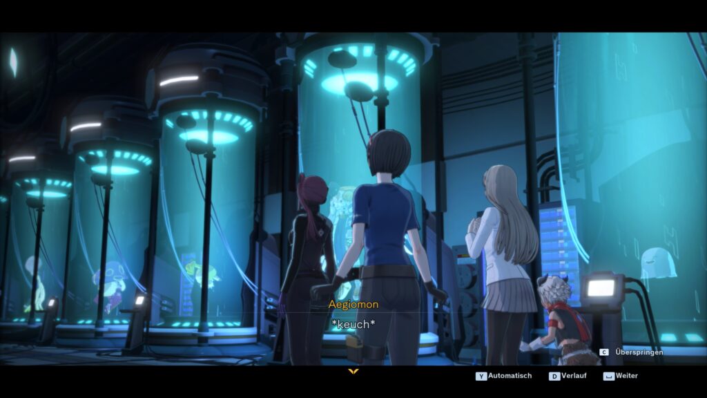 Sie führt uns durch ein Labor, in dem tatsächlich Digimon festgehalten werden. Wir verstecken uns, als ein Dr. Kuga die Subjekte begutachtet. In einem Gespräch schnappen wir auf, dass Dr. Simmons gekündigt und abgehauen ist.