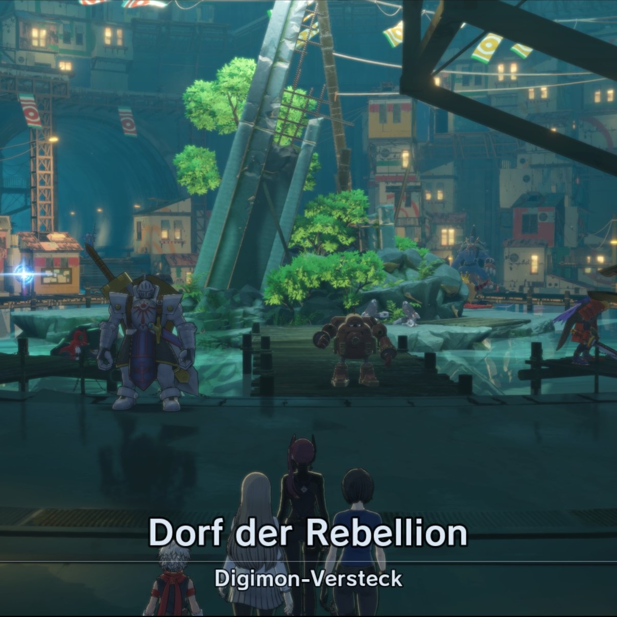 Wir folgen Asuna und landen letztlich im Dorf. Von den dortigen Digimon erfahren wir, dass Zentralstadt besetzt wurde. Auch der Zahnradwald ist gefährlich geworden. Vom Abgrund entdecken wir auch einige Digimon. Zunächst gehen wir zu Dr. Simmons und berichten ihr von allem. Danach gehen wir zu Merukimon, das auch hier gelandet war. Es erzählt uns von den Zerstörungen. Wir fragen es, ob es einen Weg gibt, den Konflikt ohne einen Kampf zu beenden. Nachdem es uns einige Bedingungen nennt, gibt er uns die Erlaubnis, das Tor in die Digiwelt zu durchschreiten.