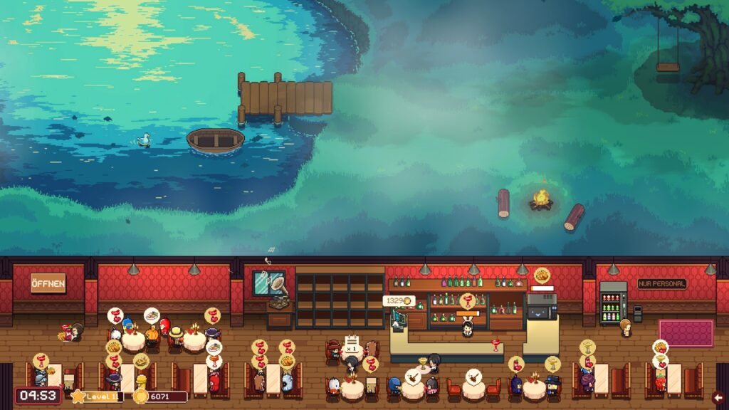 Es ist ein entspanntes Spiel, das nebenher laufen kann. Mir machts überraschend viel Spaß, auch wenn ich ab einem gewissen Punkt nichts mehr machen muss. Dieses Gewusel ist toll, wobei ich mir teilweise gerne die Animationen der Bewegungsmgöglichkeiten anschauen würde. Jack fährt bspw. mit einem Kanu durch die Bar, Rena auf Rollschuhen, Gian hat ein Einrad und Karen ein Hoverboard. Leider sind die Mitarbeiter irgendwann so flott, dass man es nur noch schwer erkennen kann.