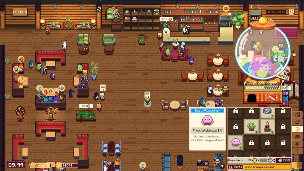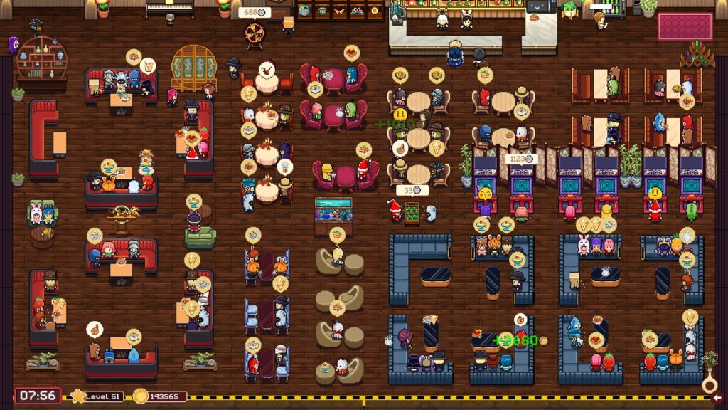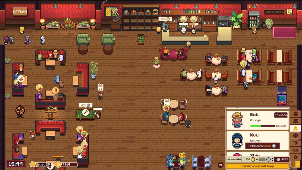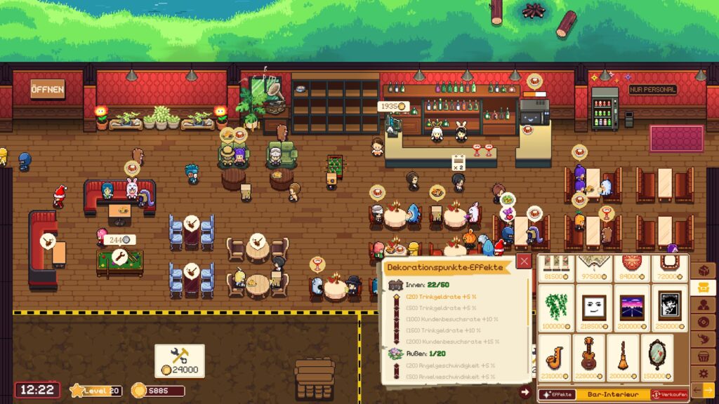 Dann gibt es sogenannte Barspiele – Tischkicker, Dartscheibe, Billiardtisch und Spielautomat – die eine zusätzliche Währung generieren, die für Indoor-Dekoration, Erinnerungskapseln oder bestimmtes Personal verwendet werden kann.