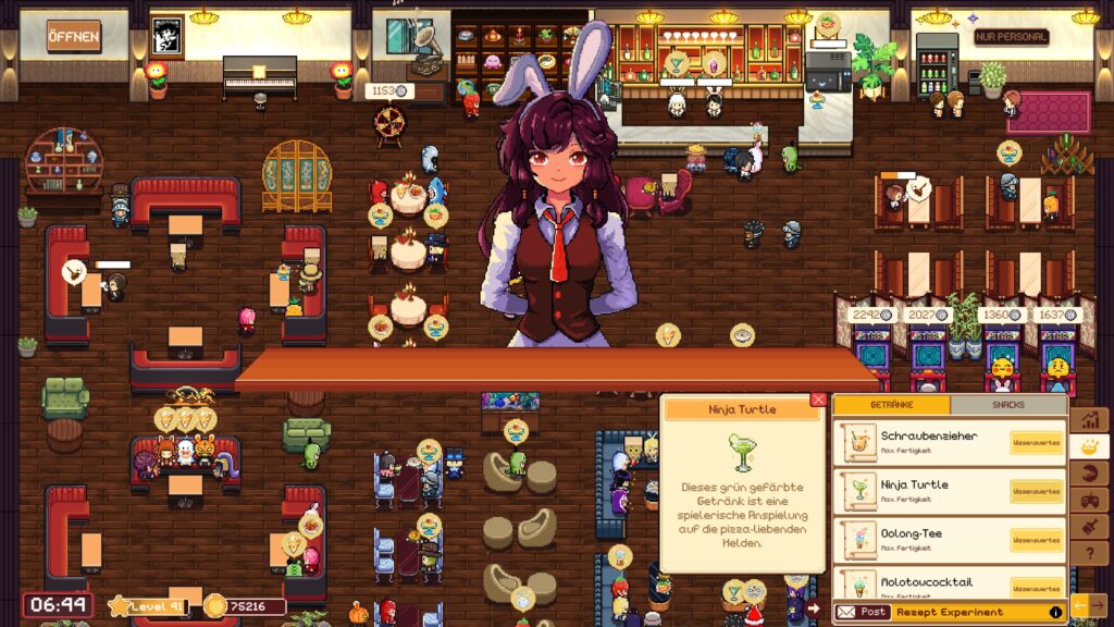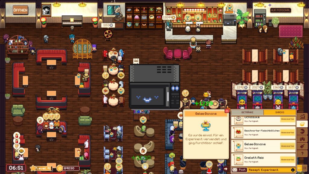 Sobald unser Level steigt, erhalten wir mehr Rezepte und mehr Menüplätze. Mit jedem Getränk und jedem Gericht können wir mehr verdienen – natürlich wird auch der Einkaufspreis teurer. Je mehr Gäste wir bekommen, desto mehr »Post« erhalten wir. Gäste erinnern sich an Getränke und Gerichte, die sogenannten »Hiddens«. Wir benötigen Hinweise, bevor wir sie herstellen können. Sobald wir sie haben, können wir sie mischen und kochen und letztlich perfektionieren. Sobald wir das geschafft haben, gibt es noch einen kleinen Fakt über das entsprechende Gericht oder den Drink.