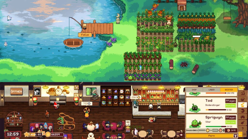 Zum Glück gibt es eine Skala, die zeigt, was dabei herauskommt und man den Kritikern keine ekelhaften Dinge serviert. Und zum Glück gibt es helfende Geister, die alle eine Aufgabe erledigen und ebenfalls in einigen Fähigkeiten aufgelevelt werden können: Säer, Bewässerer, Ernter und Bodendünger. Natürlich brauchen die Säer für ihre Arbeit das entsprechende Kleingeld in Angeltoken. Dafür kann man die Zutaten auch verkaufen, was besonders bei den qualitativ schlechten Erträgen praktisch ist. Denn zumindest bekommen wir dafür Angeltoken und können wieder neue Dinge kaufen. Noch praktischer: Der Verkauf kann pro Qualitätsstufe automatisiert werden, dadurch muss man hier auch bald nicht mehr aufpassen, sofern man sich die Geister zu Hilfe gerufen hat.